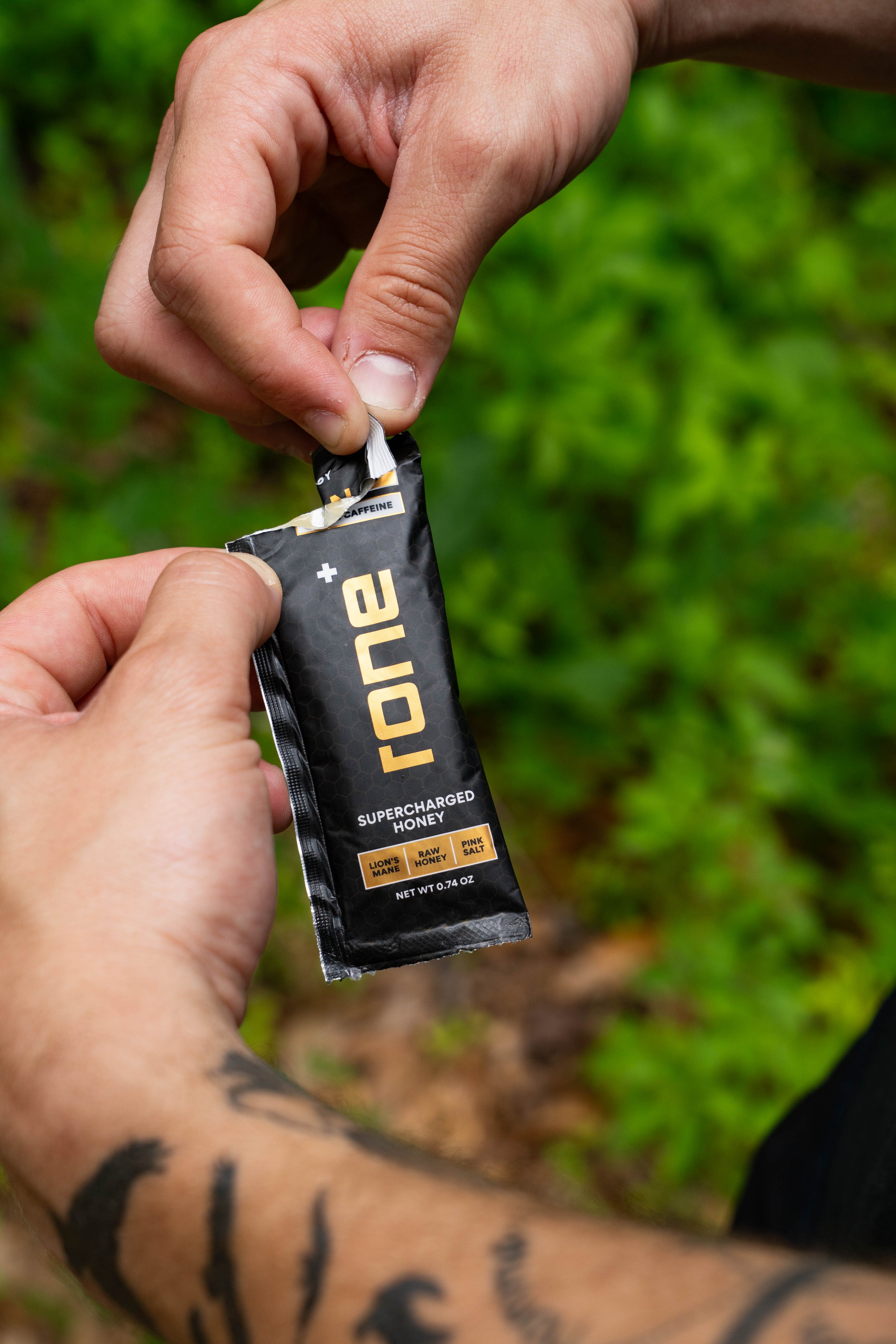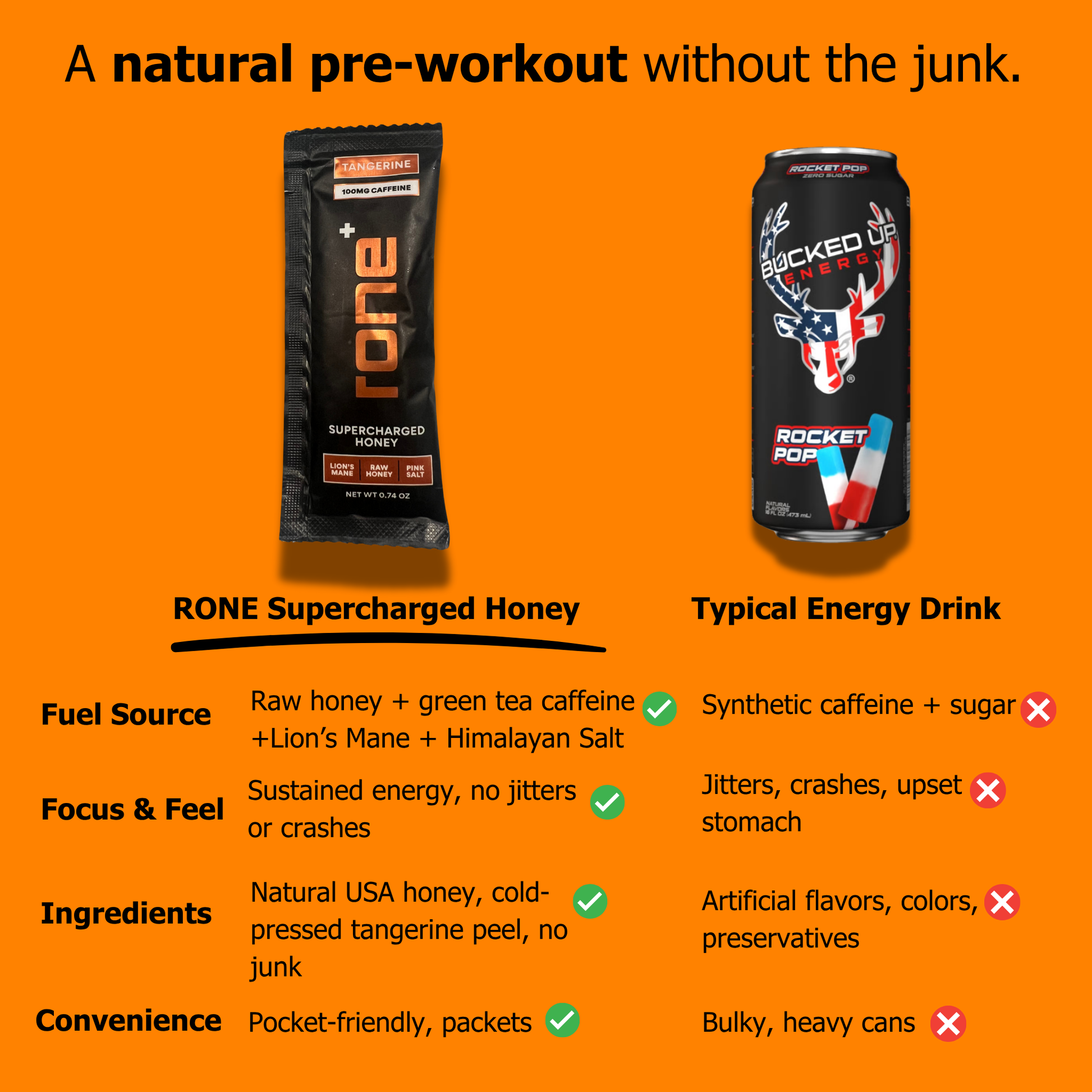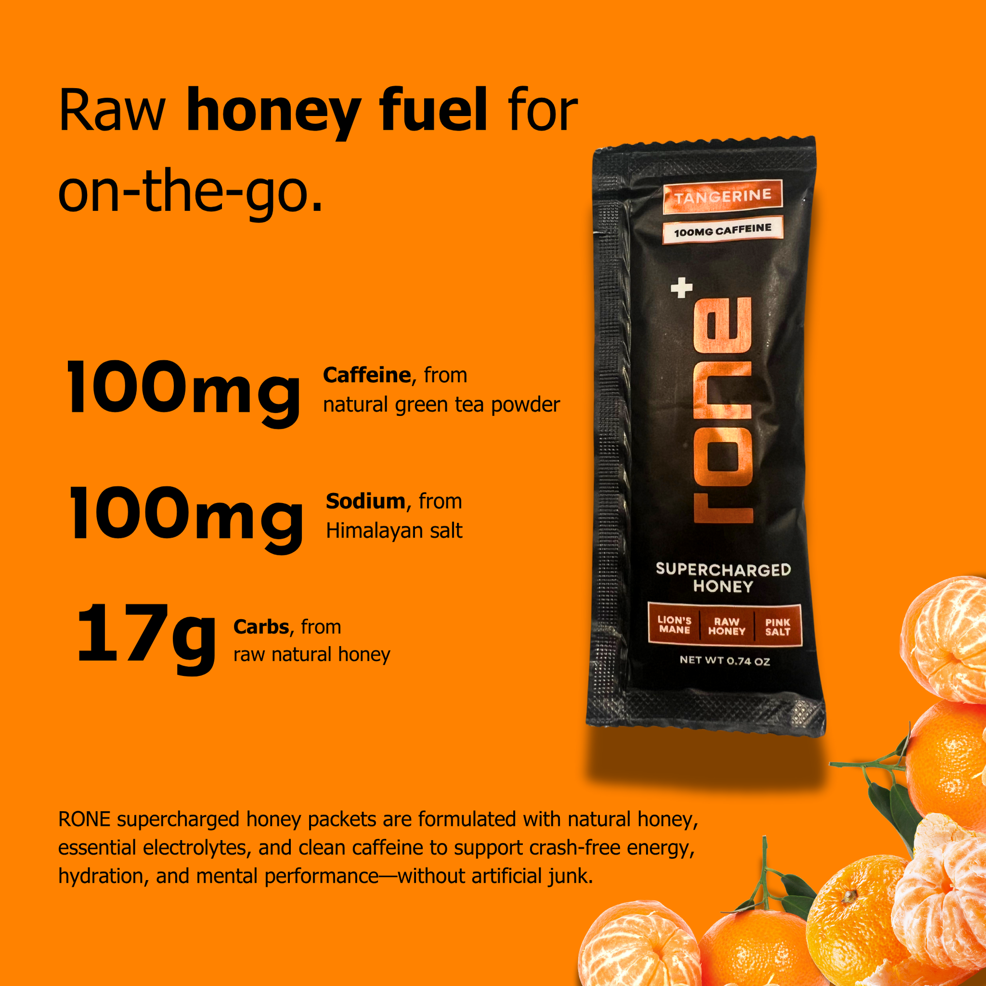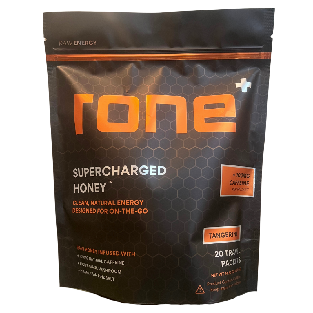 RONE SUPERCHARGED HONEY FUELS YOUR BODY THE WAY NATURE INTENDED -- WITHOUT ARTIFICIAL SWEETENERS, SYNTHETIC CAFFEINE, OR PROCESSED SUGARS.