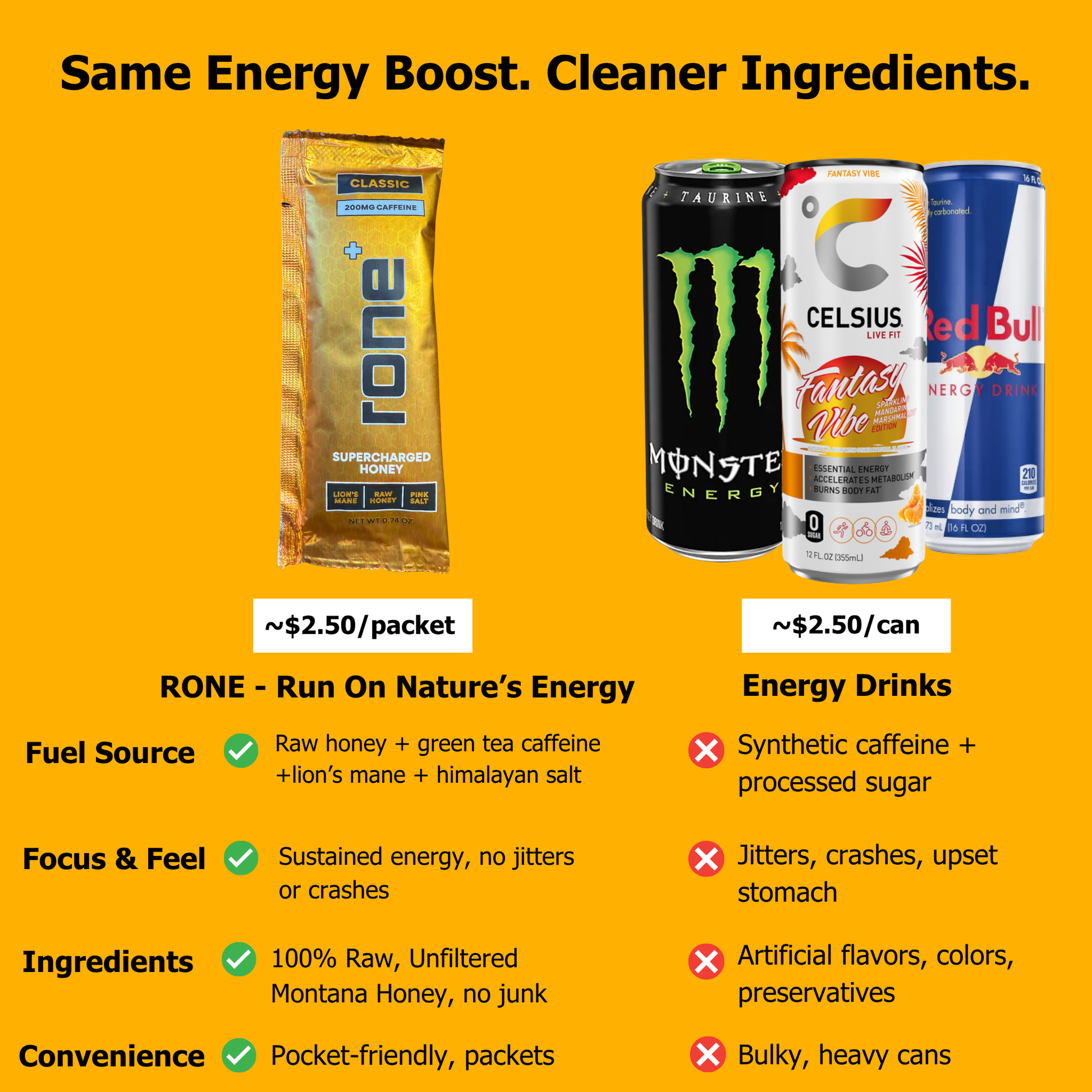 Unlike coffee or energy drinks that spike and crash your energy, Rone fuels your body with nature’s best performance blend—raw honey for lasting endurance, green tea caffeine for steady power, lion’s mane for razor-sharp focus, and Himalayan pink salt for optimal hydration. The result? Clean, sustained energy, mental clarity, and physical stamina—without jitters, crashes, or artificial junk.